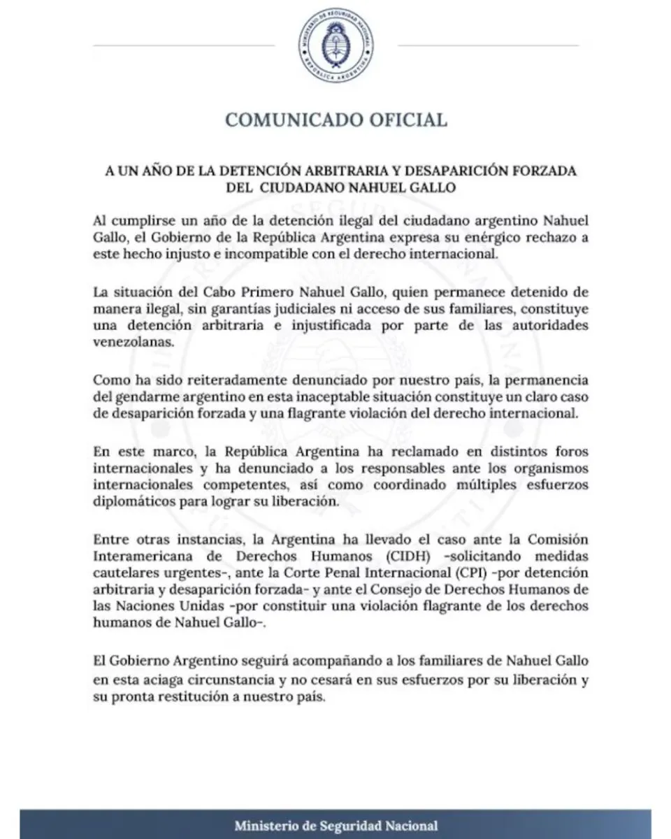 De acuerdo con lo expresado en el mensaje oficial, Gallo permanece privado de su libertad sin garantías judiciales, sin acceso a sus familiares y bajo condiciones que Argentina define como arbitrarias. El documento señala además que la desaparición forzada del Cabo Primero se encuentra amparada por tratados internacionales que prohíben de forma categórica este tipo de delitos.