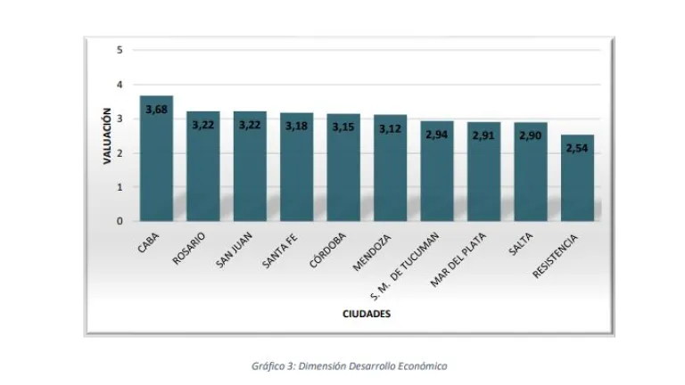 Según el informe, la Facultad de Ciencias Económicas (UBA) ubicó a la capital del país con un puntaje de 3,65, mientras que Mendoza alcanzó 3,34; Córdoba obtuvo 3,25; San Miguel de Tucumán logró 3,17 y Rosario llegó a 3,16. Más atrás aparecen San Juan y Santa Fe (2,98), Salta (2,85), Mar del Plata (2,74) y Resistencia (2,54), completando el listado de las diez ciudades más relevantes evaluadas.