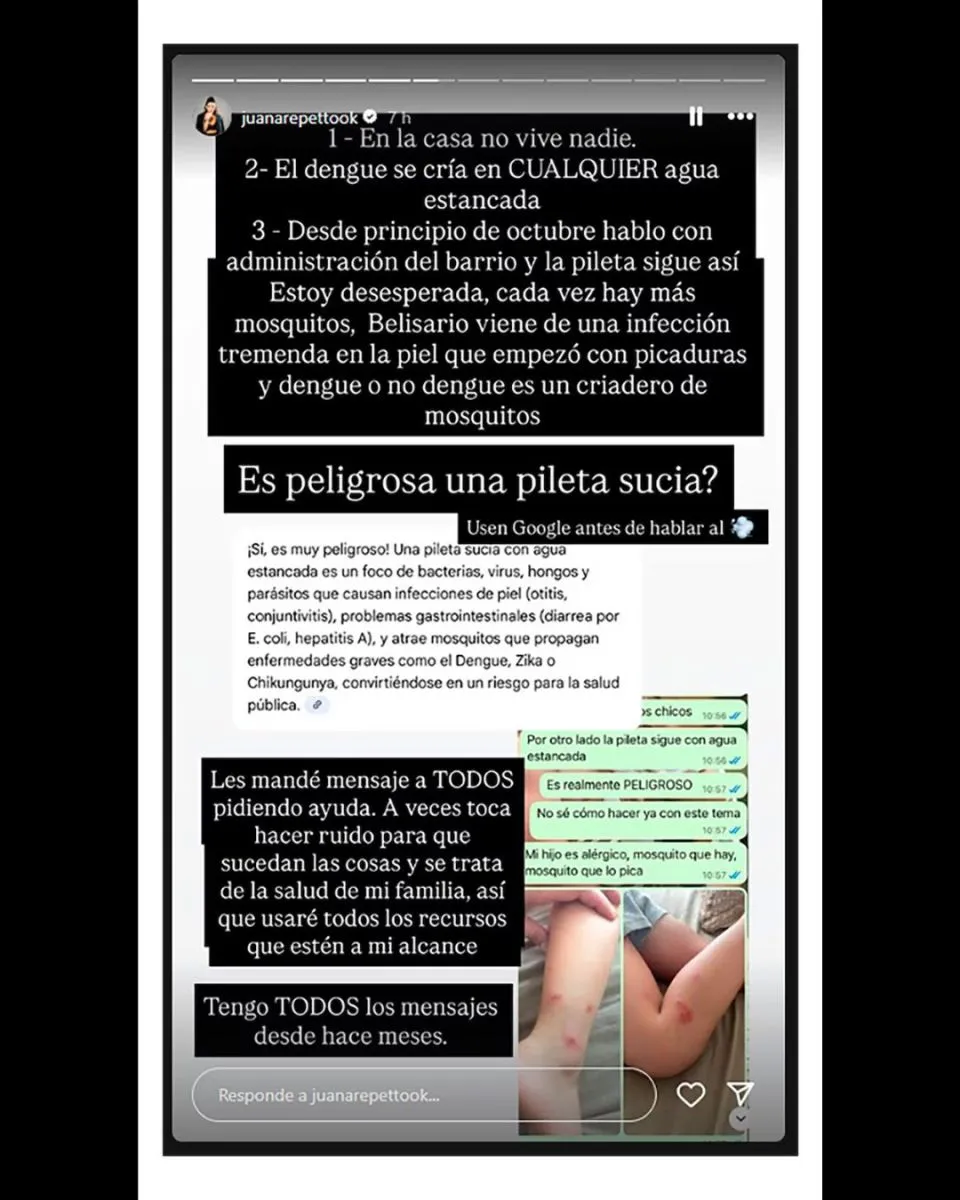 El caso tomó mayor relevancia cuando Juana reveló que su hijo Belisario sufrió las consecuencias directamente. La influencer contó que el pequeño desarrolló una infección severa en la piel que comenzó tras varias picaduras de mosquitos. “Belisario viene de una infección tremenda en la piel que empezó con picaduras. Dengue o no dengue, es un criadero de mosquitos”, expresó junto a las fotos de las lesiones. La artista aseguró sentirse desbordada por la inacción del consorcio: “Hablo con la administración del barrio y la pileta sigue así. Estoy desesperada, cada vez hay más mosquitos”, reclamó, cuestionando además que “para cobrarte están al día, pero para esto se lavan las manos”.