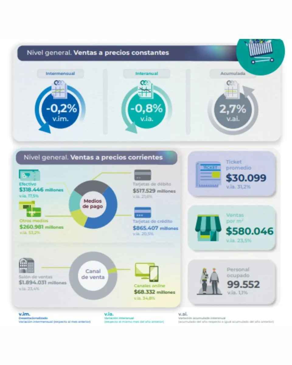 Asimismo, el último informe de la Encuesta de Supermercados del INDEC, correspondiente a septiembre de 2025, mostró una caída interanual de 0,8% en las ventas a precios constantes, aunque el acumulado enero-septiembre presentó una suba de 2,7%. En valores corrientes, las ventas alcanzaron los 1,96 billones de pesos, con incrementos destacados en rubros como indumentaria, carnes y alimentos preparados. Las compras presenciales siguen siendo predominantes, con el 96,5% del total, aunque el canal online mostró un crecimiento interanual del 34,8%, evidenciando cambios graduales en los hábitos de consumo.