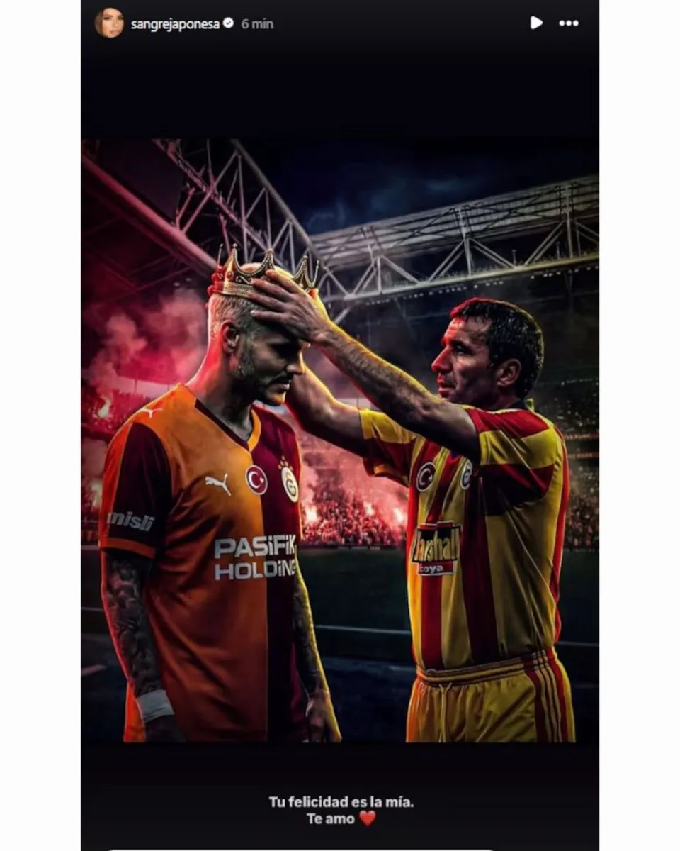 Icardi se convirtió en el futbolista extranjero con más goles en la historia del Galatasaray en la liga local, superando nada menos que a Gheorghe Hagi. Ante ese hito, la actriz compartió imágenes del estadio y de los homenajes de los hinchas, junto a un mensaje cargado de emoción: “Tu felicidad es la mía. Te amo”. La frase acompañó fotos de una bandera desplegada en la tribuna que decía: “Más que un jugador, ¡parte de nuestra alma!”, además de videos con los cánticos dedicados al goleador.