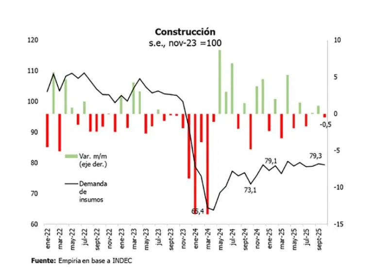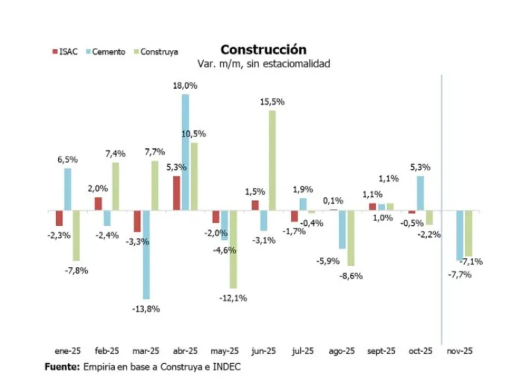 El relevamiento advierte que, pese a algunas mejoras puntuales, el balance general sigue condicionado por la recesión previa y la falta de certezas en materia de costos y financiamiento. “En octubre la construcción cayó 0,5% sin estacionalidad y creció casi 8% contra octubre del año pasado”, señaló Empiria, aunque aclaró que el crecimiento acumulado del 7,9% no alcanza para compensar el derrumbe previo. Además, los indicadores adelantados de noviembre mostraron señales negativas: “El índice ConstruYa y los despachos de cemento cayeron 7,1% y 7,7% respectivamente”.