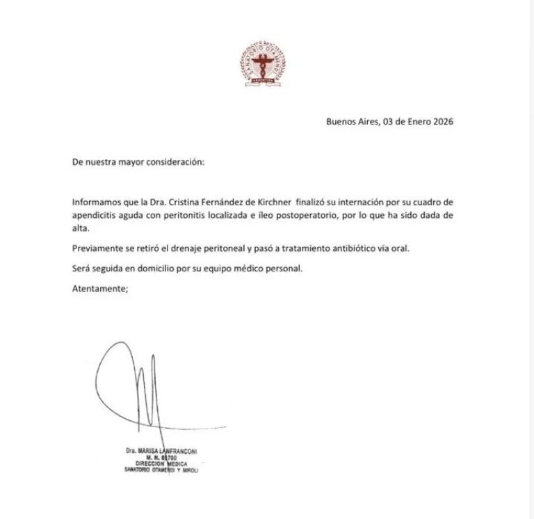 La información fue confirmada a través del último parte médico difundido por el centro de salud. En el comunicado oficial, desde el sanatorio señalaron: "Informamos que la Dra. Cristina Fernández de Kirchner finalizó su internación por su cuadro de apendicitis aguda con peritonitis localizada e íleo postoperatorio, por lo que ha sido dada de alta". De esta manera, se confirmó la evolución favorable de su estado clínico tras la cirugía de urgencia.