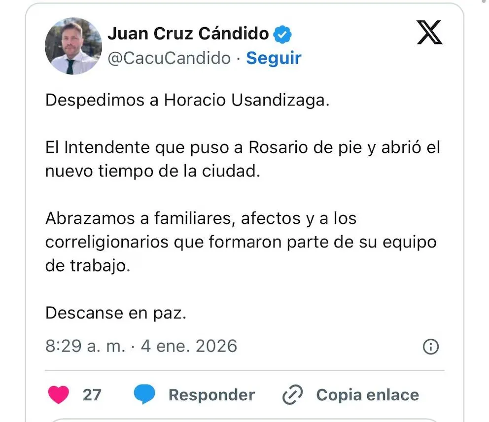 En los últimos años se había alejado de la vida pública debido a problemas de salud. Su fallecimiento motivó múltiples mensajes de despedida y la Municipalidad de Rosario decretó tres días de duelo, con banderas a media asta en homenaje a una figura clave de la historia política local.