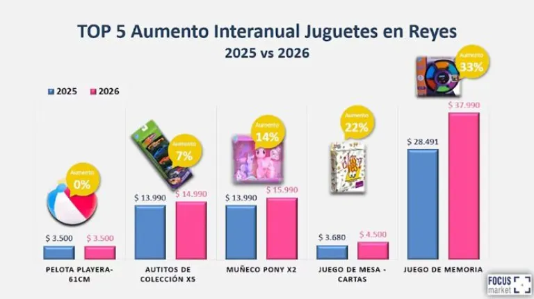 En cuanto a los valores específicos, el relevamiento muestra comportamientos dispares dentro del segmento de juguetes. Algunos productos prácticamente no registraron cambios respecto a 2025, como la pelota playera, que se mantuvo en $3.500. Otros artículos tuvieron aumentos moderados, como los autitos de colección, que pasaron de $13.900 a $14.900 (7%), y los muñecos pony, con una suba del 14%. En contraste, los mayores incrementos se observaron en un juego de mesa con cartas, que subió 22%, y en un juego de memoria, cuyo precio avanzó un 33%.