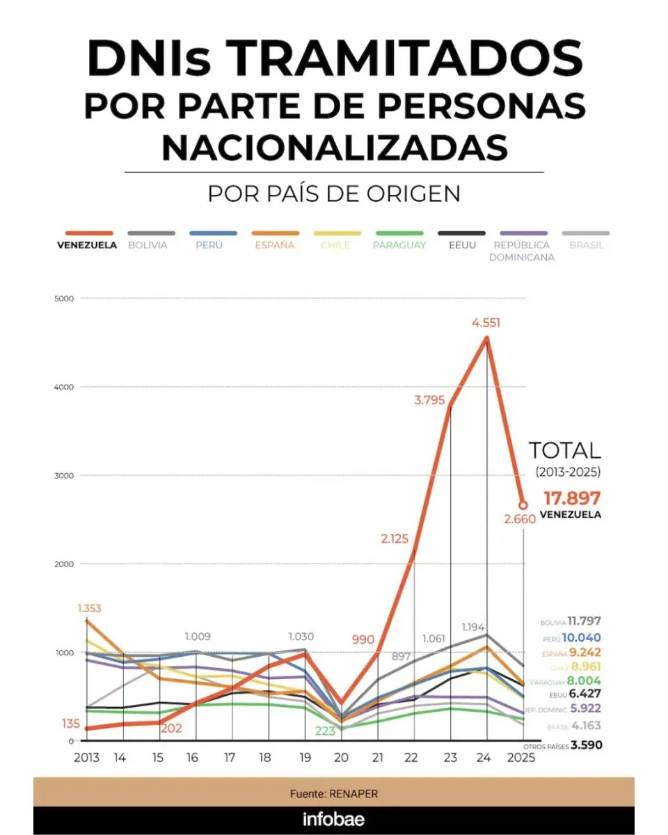 En cuanto al origen de los solicitantes, Venezuela, Bolivia y Perú encabezan el ranking de DNIs tramitados desde 2013. En el caso venezolano, el crecimiento fue sostenido: de apenas 135 trámites en 2013 se pasó a 4.551 en 2024, acumulando 17.897 documentos. La exdirectora de Migraciones y actual diputada Florencia Carignano detalló: “Una disposición de 2019 permitía el ingreso de venezolanos con documentación vencida y a medida que tuvieron tiempo para regularizar la situación del país -conseguir los antecedentes penales de Venezuela y Argentina-, obtuvieron el DNI porque cumplieron los requisitos para poder tener la nacionalidad; han realizado los trámites judiciales y la Justicia resolvió a su favor”.