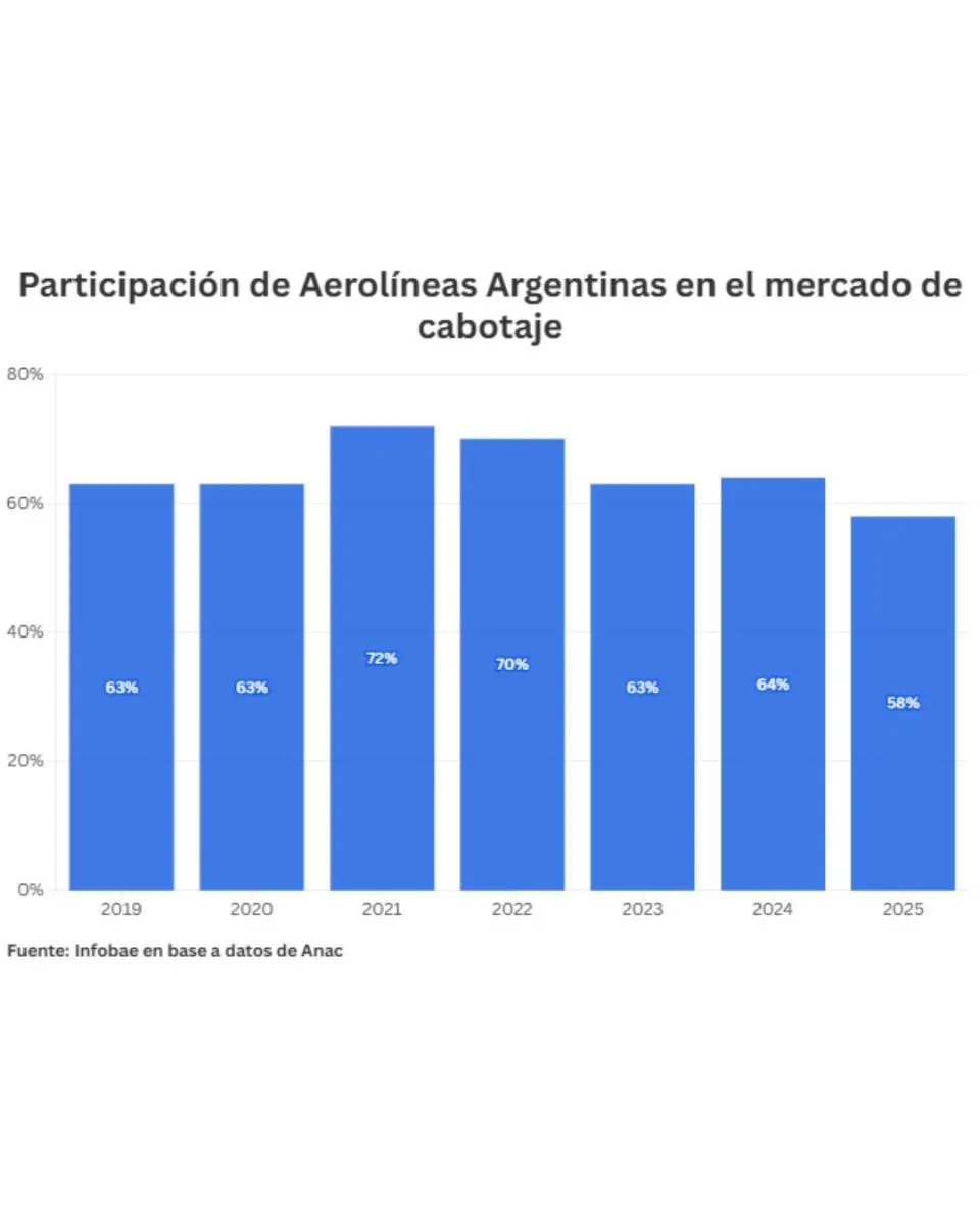 De acuerdo con datos oficiales de la Administración Nacional de Aviación Civil (ANAC), la empresa estatal perdió 14 puntos de participación en el mercado doméstico en apenas cuatro años. En 2019 y 2020 concentraba el 63% de los pasajeros de cabotaje, cifra que llegó al 72% en 2021, aún bajo el impacto de la pandemia. Sin embargo, desde 2022 comenzó un retroceso sostenido: pasó al 70%, y continuó descendiendo hasta ubicarse en el 58% durante 2024, pese a mantener el liderazgo del sector.