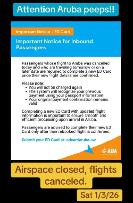 El servicio inaugural iba a trasladar a 170 pasajeros en el primer vuelo regular directo de la aerolínea nacional hacia la isla caribeña, ubicada frente a las costas venezolanas. Sin embargo, la restricción aérea volvió inviable la operación en ese momento. Según trascendió, los viajeros afectados fueron reubicados en vuelos posteriores, de acuerdo con la disponibilidad, y este domingo finalmente se concretó la salida hacia Aruba sin inconvenientes.