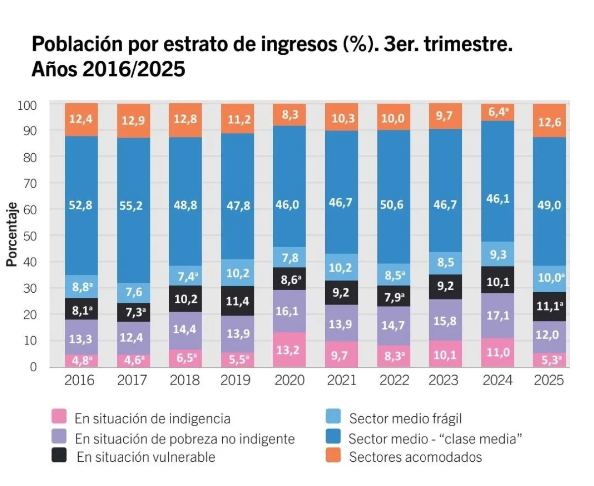 En paralelo, se observa una reducción en los sectores más críticos. La población en situación de indigencia y en pobreza no indigente disminuyó en comparación con 2024, mientras que el segmento considerado vulnerable se mantuvo relativamente estable, según la serie histórica que abarca desde 2016.