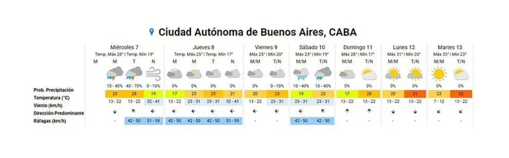 En la Ciudad de Buenos Aires, el pronóstico anticipa chaparrones durante la madrugada del miércoles y tormentas hacia el mediodía y la tarde. Las temperaturas se ubicarán entre los 19°C de mínima y los 28°C de máxima, con probabilidades de precipitaciones que irán en aumento a lo largo del día. Además, se espera una noche ventosa, con ráfagas que podrían llegar a los 59 km/h. Para el jueves, las condiciones tenderían a mejorar, con cielo parcialmente nublado y registros térmicos que oscilarán entre los 17°C y los 25°C, mientras que hacia el fin de semana disminuirían las chances de lluvia.