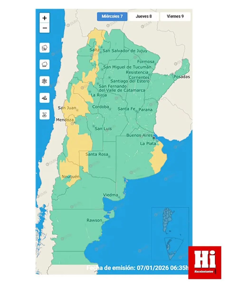 En paralelo, el organismo meteorológico extendió las alertas por tormentas a otras regiones del país. Durante este miércoles, diez provincias permanecen bajo alerta amarilla: Salta, Jujuy, Tucumán, Catamarca, La Rioja, San Juan, Mendoza, La Pampa y el norte de Neuquén. En esas zonas se esperan lluvias y tormentas de variada intensidad, algunas localmente fuertes, con abundante caída de agua en cortos períodos, actividad eléctrica frecuente, posible granizo y ráfagas que podrían alcanzar los 90 km/h. Los acumulados de precipitación se estiman entre 15 y 70 milímetros, con posibilidad de superar esos valores de manera puntual.