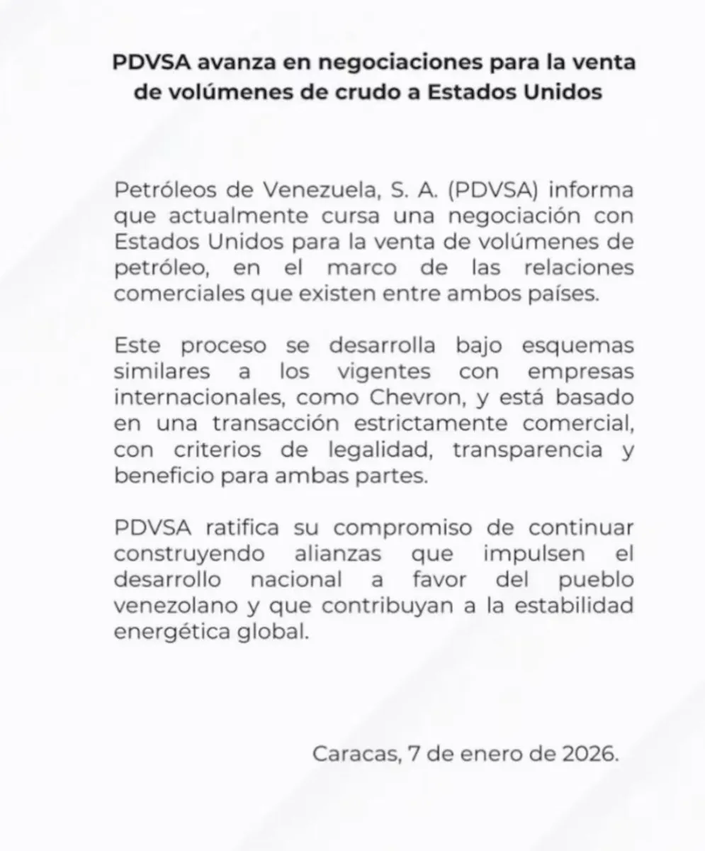 Según explicó la compañía en un comunicado oficial, las tratativas se desarrollan bajo parámetros ya utilizados con firmas extranjeras. “Este proceso se desarrolla bajo esquemas similares a los vigentes con empresas internacionales, como Chevron, y está basado en una transacción estrictamente comercial, con criterios de legalidad, transparencia y beneficio para ambas partes”, sostuvo PDVSA al confirmar las negociaciones.