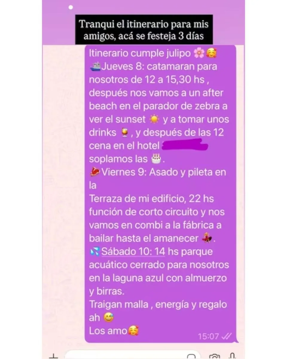 La previa comenzó con una serie de historias que marcaron el tono del evento. “Se viene mi cumpleaños amiguitos. Temporada de Capri”, escribió junto a un look rosado de aire retro. Luego, Juli mostró la captura del mensaje de WhatsApp que envió a sus amigos, donde detalló horarios y actividades. “Tranqui el itinerario para mis amigos, acá se festeja tres días”, aclaró con ironía antes de desplegar el ambicioso plan que rápidamente se volvió viral.
