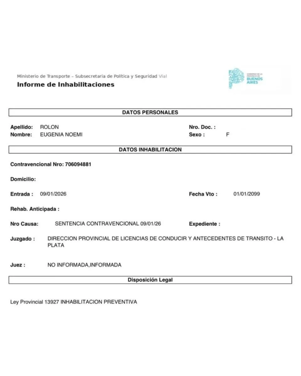 El Ministerio de Transporte de la provincia de Buenos Aires resolvió impedir de manera preventiva que Eugenia Rolón pueda tramitar la licencia de conducir. La decisión se tomó luego de un siniestro vial ocurrido en Mar de Ajó que encendió alertas por la gravedad de las infracciones cometidas.