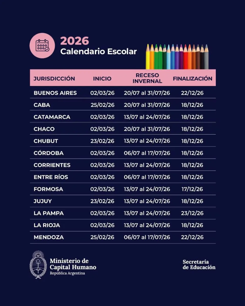 Las autoridades nacionales y provinciales confirmaron el calendario escolar 2026, que fija el comienzo de clases entre el 18 de febrero y el 2 de marzo, según cada jurisdicción. La resolución fue acordada por unanimidad y mantiene la meta de asegurar un mínimo de 190 días de clase.