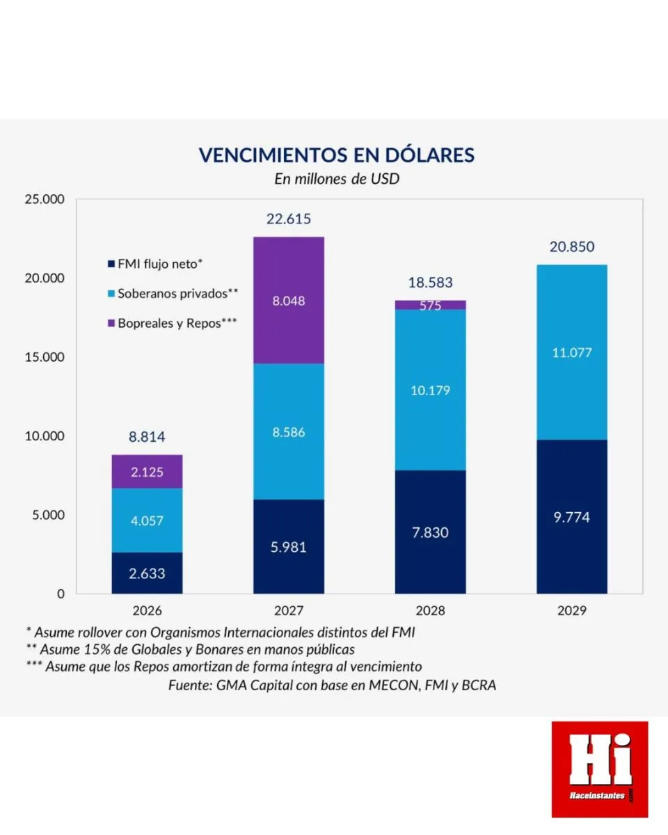 De acuerdo con un informe de GMA Capital, tras el pago reciente los vencimientos en dólares con acreedores privados y el FMI alcanzan unos USD 8.800 millones durante el resto de 2026, cuando antes superaban los USD 12.500 millones. “Con el pago ya realizado y la línea de crédito en marcha, el perfil de vencimientos en dólares muestra una nueva configuración. Estimamos que las obligaciones en dólares con privados y el FMI alcanzarán los US$9000 millones en lo que resta de 2026. Pero en 2027, el número escala hasta US$23.000 millones”, señaló la consultora.