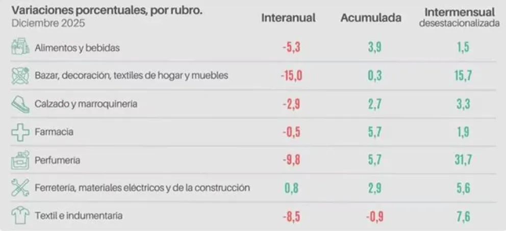 El análisis por rubros confirmó un panorama mayormente recesivo en diciembre, con seis de los siete sectores en retroceso. Las caídas más fuertes se dieron en Bazar y decoración (-15%), Perfumería (-9,8%) y Textil e indumentaria (-8,5%). Alimentos y bebidas también retrocedió un 5,3%, con consumidores enfocados en compras puntuales y promociones. La única excepción fue Ferretería, materiales eléctricos y de la construcción, que logró una leve suba del 0,8% impulsada por tareas de mantenimiento estacionales.