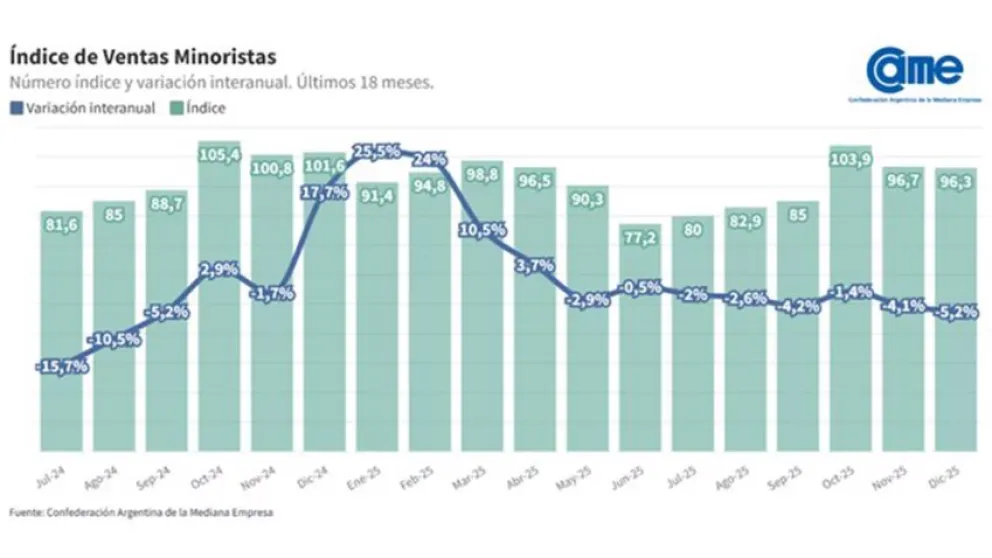 De acuerdo con el índice elaborado por la Confederación Argentina de la Mediana Empresa (CAME), este desempeño permitió cerrar el año con un crecimiento acumulado del 2,5%. Sin embargo, la entidad advirtió que el repunte de diciembre no alcanzó para revertir la tendencia de fondo. “Diciembre funcionó como un alivio financiero gracias a las fiestas de fin de año y al cobro de aguinaldos, pero no logró revertir la caída estructural del 5,2%. El consumo se mantuvo retraído y estrictamente racional, con familias que priorizaron ofertas y gastos esenciales ante la persistente falta de poder adquisitivo”, señaló el informe.