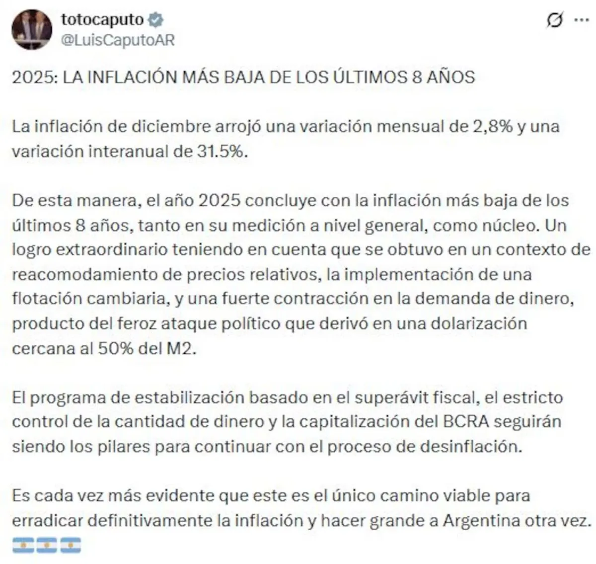 Tras conocerse el índice de inflación de diciembre, que marcó un 2,8% mensual y un acumulado anual del 31,5% en 2025, referentes del Gobierno nacional salieron a destacar el resultado.
