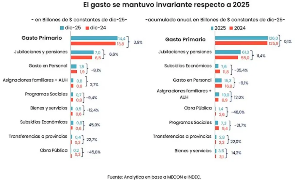 Durante 2025, el gasto público nacional se mantuvo en niveles históricamente bajos, pese a que el ajuste fiscal perdió intensidad respecto del año anterior. En términos reales, la variación interanual fue de apenas 0,1% una vez descontada la inflación. Sin embargo, más allá del dato agregado, el cambio más relevante estuvo en la composición de las erogaciones, con un giro en las prioridades presupuestarias y una redistribución de recursos entre distintas áreas del Estado.