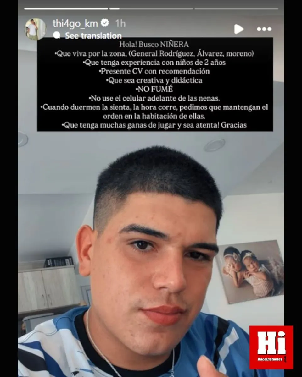 La convocatoria fue realizada por el propio Thiago a través de sus historias de Instagram, donde detalló con precisión los requisitos que debe cumplir la persona interesada. “¡Hola! Busco niñera que viva por la zona (General Rodríguez, Álvarez, Moreno), que tenga experiencia con niños de 2 años, presente CV con recomendación, sea creativa y didáctica y no fume. Es importante que no use el celular adelante de las nenas y que, cuando duerman la siesta, que la hora corre, pedimos que mantengan el orden en la habitación de ellas", escribió el joven, dejando en claro sus prioridades.