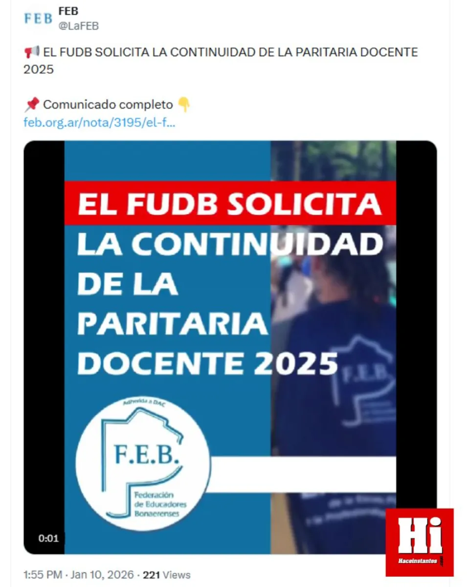 Al respecto, el Frente de Unidad Docente Bonaerense (FUDB), que nuclea a los principales gremios del sector educativo, destacó la convocatoria para dar continuidad a las negociaciones paritarias. Desde el FUDB aclararon que la propuesta fue considerada insuficiente y que la reunión pasó a un cuarto intermedio.