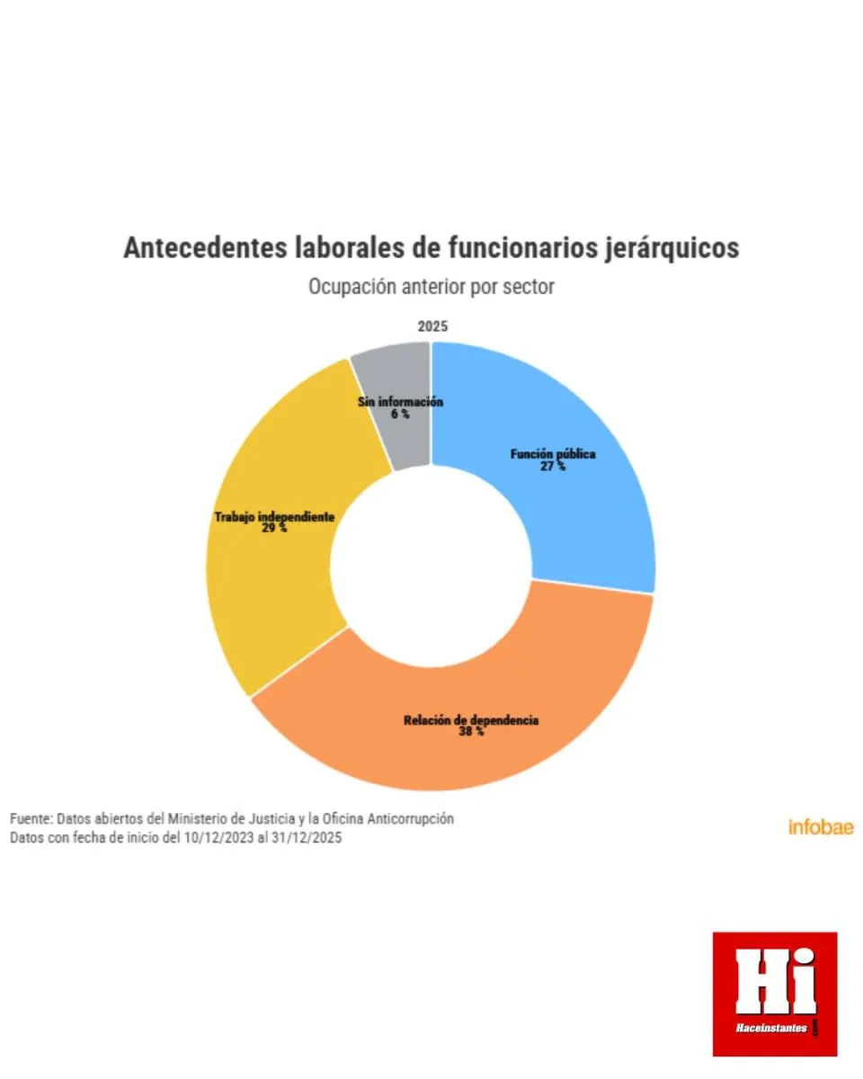 Un reciente informe sobre las declaraciones juradas de antecedentes laborales presentadas ante la Oficina Anticorrupción (OA) revela un cambio significativo en el perfil de los funcionarios públicos jerárquicos. En la actual gestión de Javier Milei, el 67% de quienes ocupan cargos de alta responsabilidad declaró haber trabajado previamente en la actividad privada, ya sea como profesionales independientes o en relación de dependencia. Solo el 27% proviene de manera inmediata de otros puestos en la función pública, un giro marcado respecto de administraciones anteriores.