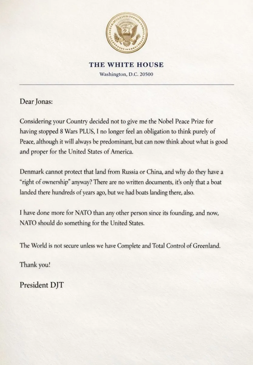 El mandatario utilizó la carta para insistir también en su postura sobre la seguridad estratégica en el Atlántico Norte y el control de Groenlandia, señalando que Washington debe jugar un rol dominante. Según trascendió, Trump sostuvo que “el mundo no estará seguro a menos que tengamos dominio completo de Groenlandia”.