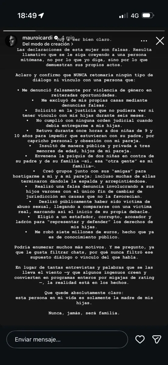 En otro tramo del mensaje, Icardi apuntó contra el entorno legal de su expareja y denunció maniobras judiciales destinadas a modificar jurisdicciones que no le resultaban favorables. “Eligió a un estafador, corrupto, acosador y ladrón para ‘representar y defender’ los derechos de mis hijas”, escribió, en uno de los pasajes más duros del texto.