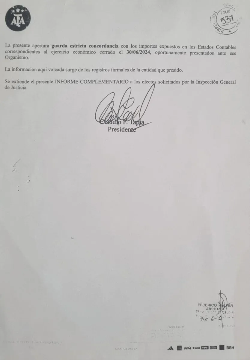 La Asociación del Fútbol Argentino, con la firma de Claudio “Chiqui” Tapia, elevó ante la Inspección General de Justicia un escrito para responder a las observaciones realizadas sobre sus estados contables. Sin embargo, fuentes con acceso al expediente señalaron que el nivel de detalle del informe no alcanza para disipar las dudas del organismo de control, que continúa analizando el balance más voluminoso de la historia reciente de la entidad.