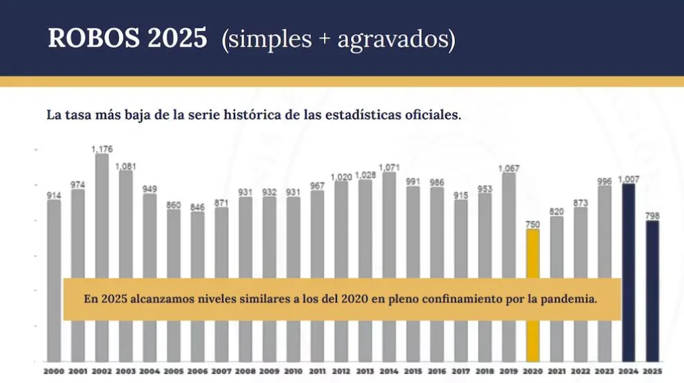 Además, destacó que los robos simples y agravados registraron una reducción interanual del 20,8% en comparación con 2024.