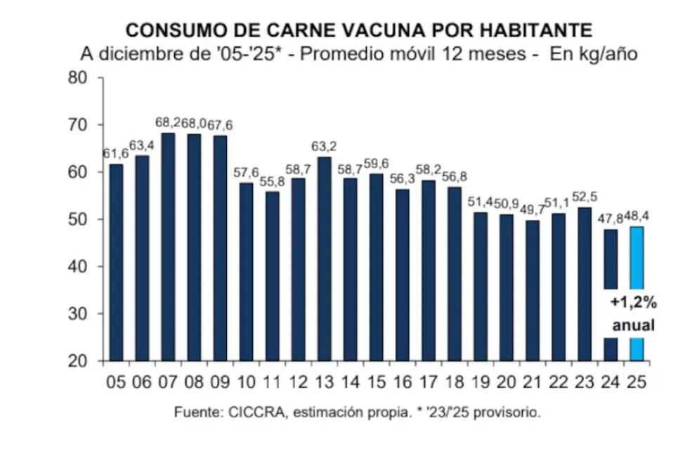 “De esta forma, en 2025 el consumo aparente de carne vacuna se recuperó un 2,4% respecto al año anterior, alcanzando un total de 2,297 millones de toneladas res con hueso (r/c/h), lo que representa un aumento de 53,4 mil toneladas. El consumo per cápita también creció, llegando a 48,4 kilos por habitante al año, un incremento del 1,2% (+0,6 kg/habitante/año)”, señaló CICCRA. Desde la entidad remarcaron que este comportamiento confirma una etapa de transición compleja para la ganadería, atravesada por la escasez de hacienda, la recomposición de valores y un delicado equilibrio entre oferta y demanda.