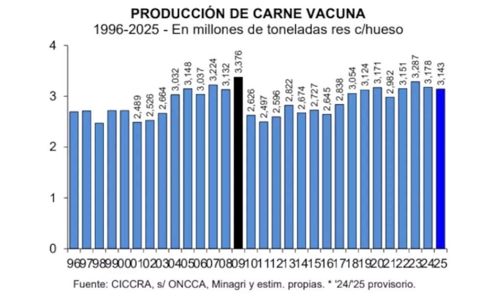 De acuerdo con un informe de la Cámara de la Industria y Comercio de Carnes y Derivados de la República Argentina (CICCRA), la producción de carne vacuna cayó un 1,1% interanual como consecuencia de la menor disponibilidad de hacienda para faena. En términos concretos, esto implicó una merma de 35,1 mil toneladas res con hueso, con una producción total estimada en 3,143 millones de toneladas durante todo el año. Esta contracción productiva refleja un escenario ajustado que condiciona la oferta.
