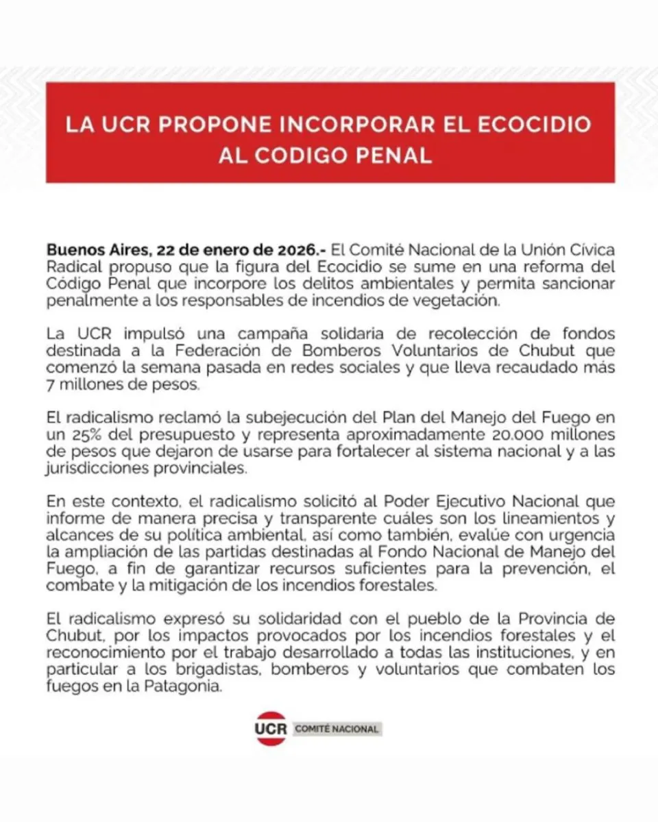 En un comunicado, la UCR también cuestionó la ejecución de los recursos destinados al combate de incendios y denunció la “subejecución” del presupuesto del Plan Nacional de Manejo del Fuego en un 25%: “Representa aproximadamente 20.000 millones de pesos que dejaron de usarse para fortalecer al sistema nacional y a las jurisdicciones provinciales”. Además de impulsar la tipificación del ecocidio, el partido promueve una campaña de recaudación para apoyar a la Federación de Bomberos Voluntarios de Chubut y exige mayores partidas para prevención y respuesta.