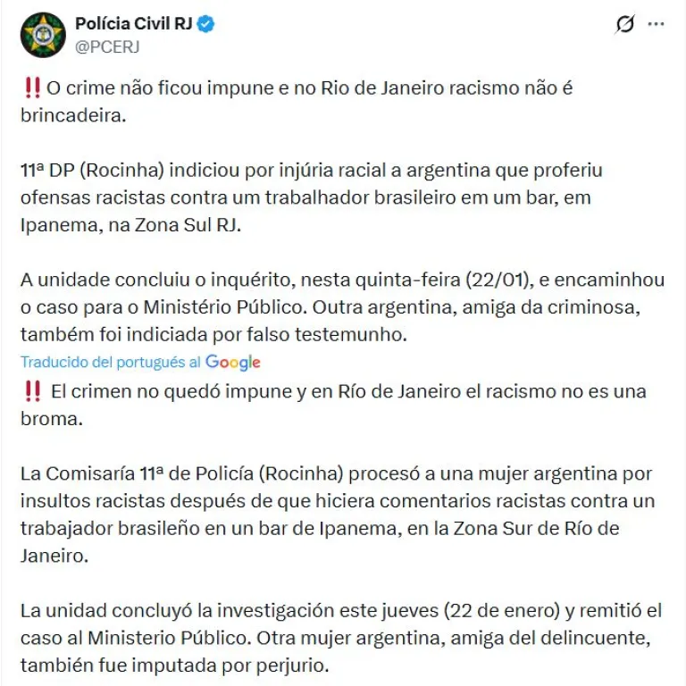 Al comunicar la decisión, la fuerza difundió un mensaje contundente en sus redes oficiales: “El crimen no quedó impune y en Río de Janeiro el racismo no es una broma”. En el mismo anuncio, se confirmó que una amiga de Páez, también argentina, fue imputada por falso testimonio en el marco de la causa.
