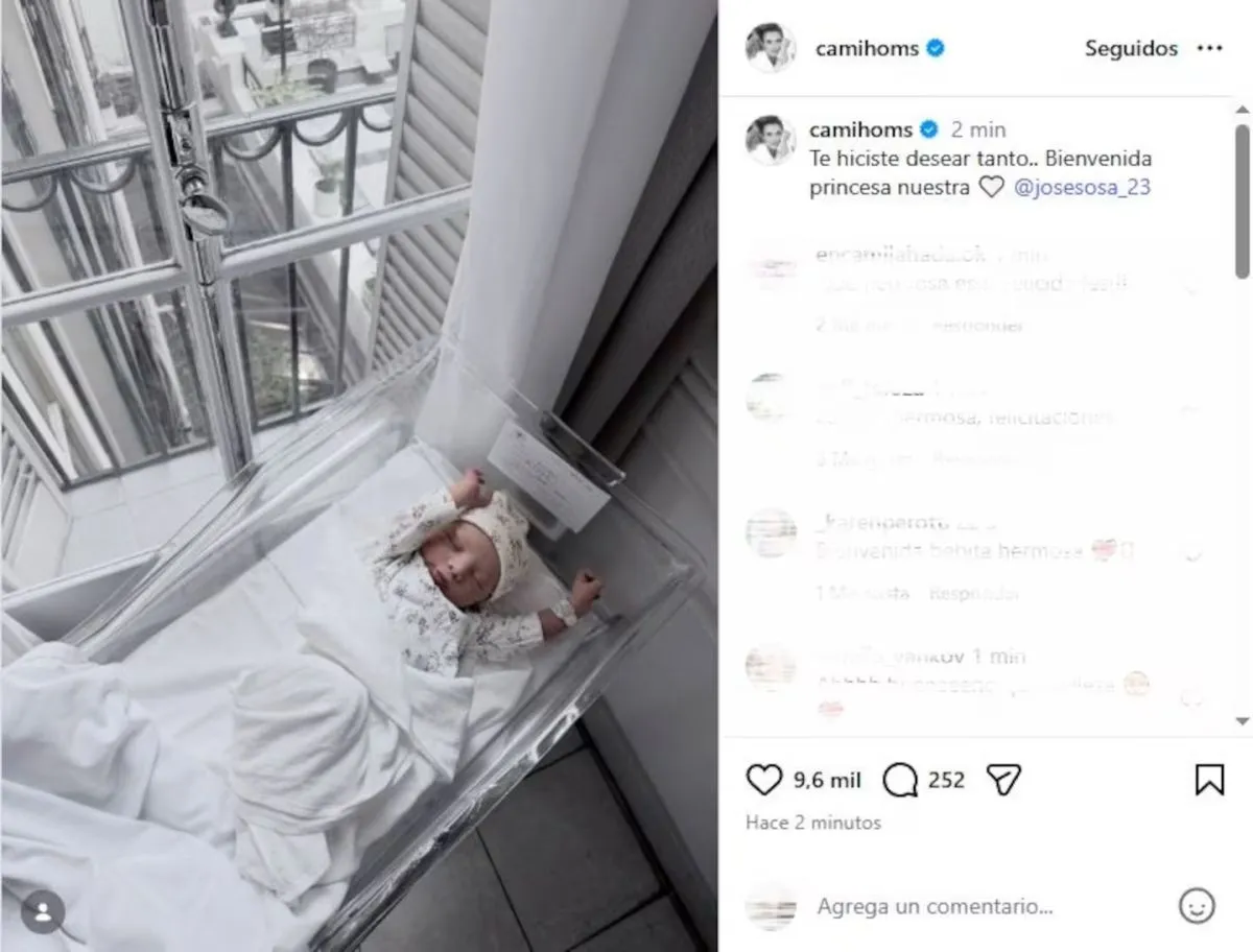 En la foto, se observa a la recién nacida recostada, envuelta en una manta clara, en un clima de absoluta ternura. Junto a la postal, Homs escribió una frase breve pero cargada de emoción: “Bienvenida, princesa nuestra”, mensaje que fue replicado por familiares, amigos y seguidores.