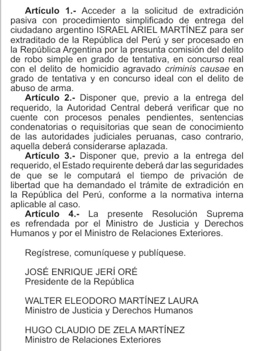 Según el texto oficial firmado por el presidente interino peruano José Jerí, el canciller Hugo de Zela y el ministro de Justicia Walter Martínez, la extradición fue aprobada porque se cumplieron los requisitos legales establecidos en el Acuerdo de Extradición entre ambos países.
