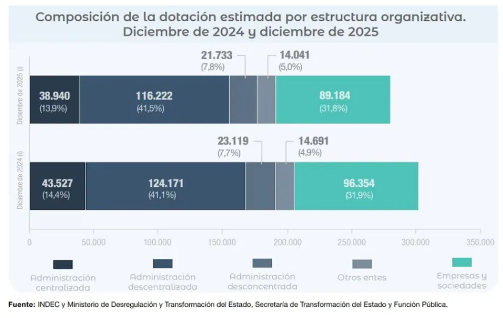 Si se observa el último año completo, el achicamiento continuó. Entre diciembre de 2024 y diciembre de 2025, la plantilla total del sector público nacional se redujo de 301.862 a 280.120 personas, con una pérdida de 21.742 puestos en doce meses. Dentro de ese período, la administración centralizada, ministerios y organismos que dependen directamente del Poder Ejecutivo, fue una de las áreas más afectadas, con una baja de 4.587 empleos (-10,5%). También retrocedieron la administración descentralizada (-7.949), la desconcentrada (-716) y los llamados “otros entes” (-172).
