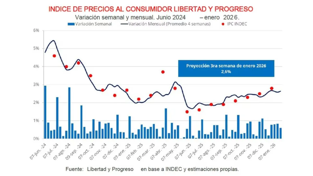 Según Libertad y Progreso, el Índice de Precios al Consumidor (IPC) de enero proyecta un aumento de 2,6% mensual, levemente por debajo del 2,8% registrado en diciembre. De confirmarse, la inflación interanual se ubicaría en 32,1%, lo que evidencia una aceleración respecto a los meses anteriores. La consultora detalló que la inflación mostró una desaceleración hacia el final del mes, con incrementos semanales del 0,8% en las primeras dos semanas y 0,6% en la tercera.