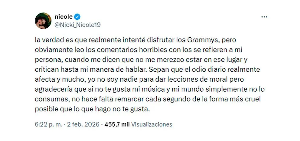 De este modo, Nicki Nicole buscó cerrar la polémica dejando en claro que el cruce con Billie Eilish fue amistoso y que la verdadera discusión pasa por el impacto del odio digital y sus consecuencias.