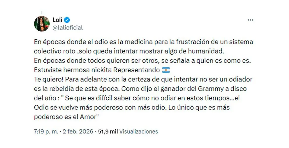 El mensaje de Nicki generó una fuerte repercusión y cosechó el respaldo de varias figuras del espectáculo. Entre ellas, Lali Espósito, quien publicó un mensaje en apoyo a la rosarina y cuestionó la naturalización del maltrato en redes sociales.