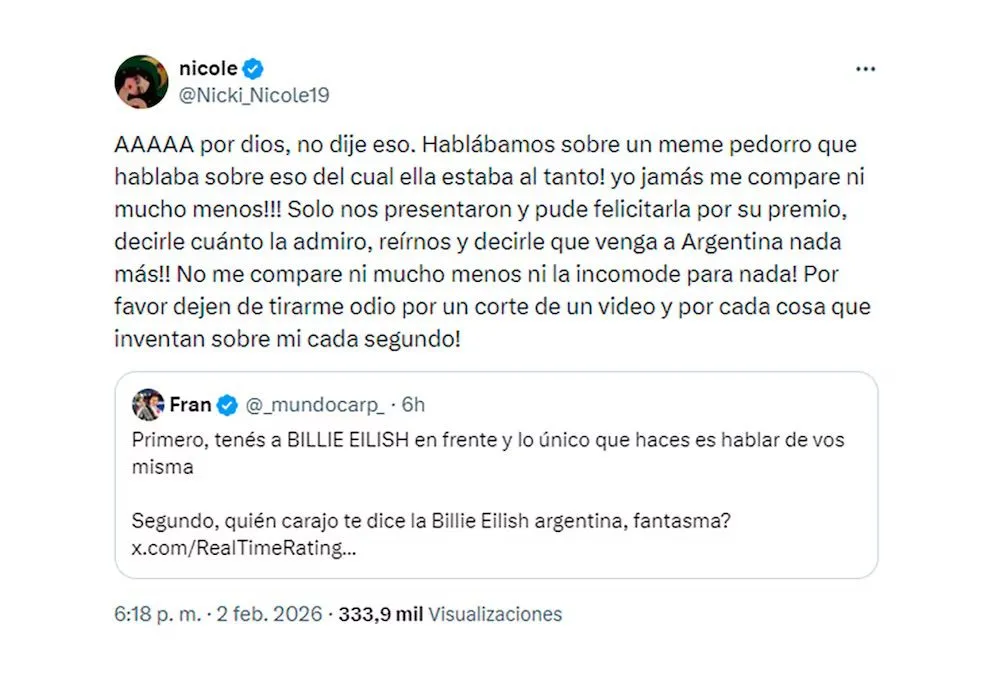 Ante la repercusión, Nicki decidió expresarse desde su cuenta de X para aclarar lo ocurrido. “Nunca me comparé con Billie Eilish”, aseguró, y explicó que la conversación tuvo que ver con un meme que ambas conocían y que circula hace tiempo en internet.