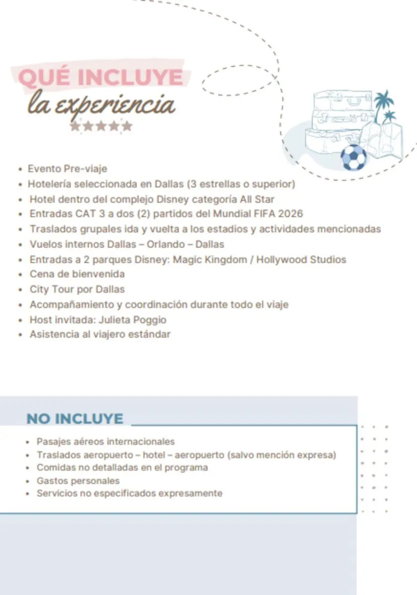 Tras los encuentros deportivos, la experiencia continúa en Orlando, con alojamiento dentro del complejo Disney y entradas a Magic Kingdom y Hollywood Studios. Además, el paquete incluye vuelos internos entre ciudades, hoteles de categoría turista, traslados, una cena de bienvenida y asistencia al viajero estándar.