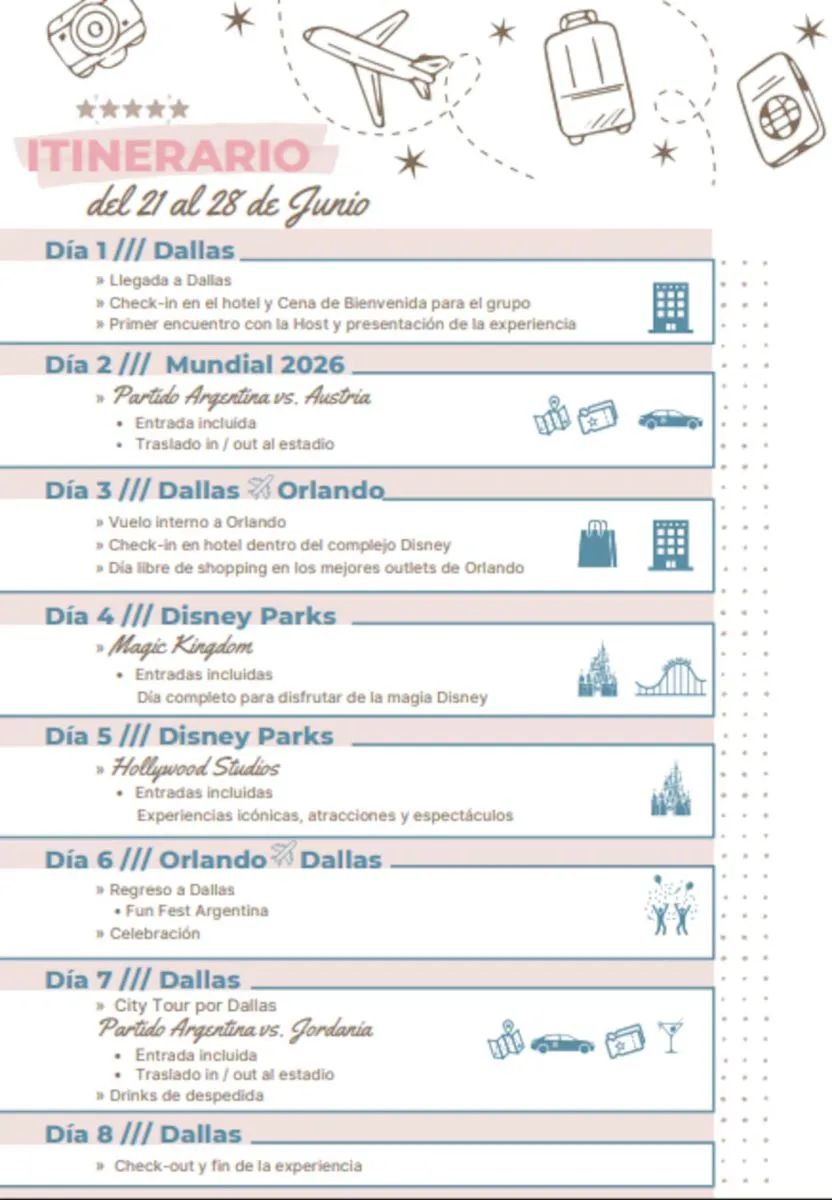 El viaje está programado entre el 21 y el 28 de junio de 2026 y contempla una primera etapa en Dallas, Texas, donde el grupo asistirá a dos partidos de la Selección Argentina correspondientes a la fase de grupos del Mundial. Según se informó, las entradas incluidas son categoría 3 y el itinerario contempla traslados y acompañamiento permanente.