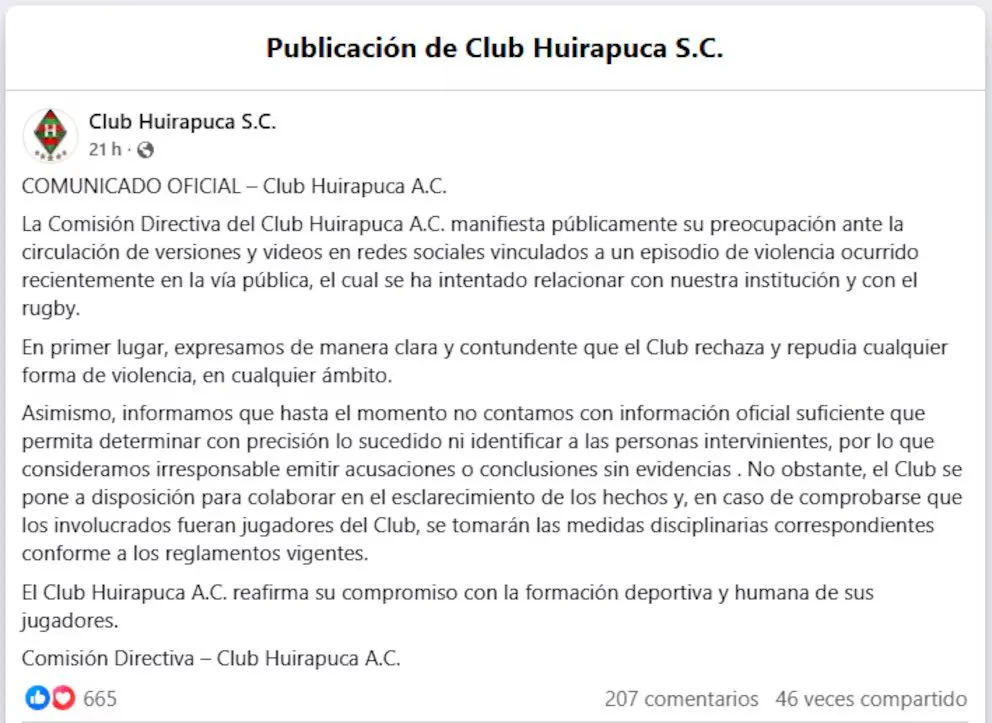 Por su parte, el Club Huirapuca A.C., vinculado por versiones de redes sociales, emitió un comunicado donde rechaza cualquier tipo de violencia y aclara que “no hay pruebas oficiales que vinculen a nuestros jugadores con el hecho”. Además, aseguró que colaborará con la investigación y aplicará sanciones internas si se confirma la participación de algún afiliado.