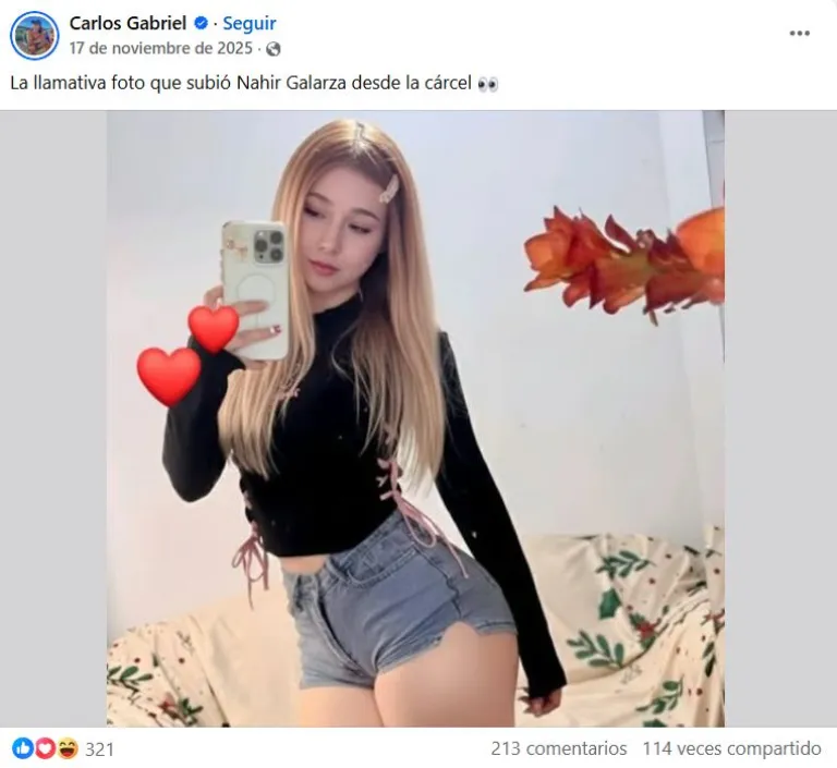 Además, aparecieron perfiles con contenido provocador que buscan entablar diálogos personales o vínculos sentimentales con usuarios. En uno de esos espacios se difundió incluso una frase atribuida falsamente a Galarza: “Si van a querer algo conmigo, quiero que sea en libertad y afuera”, lo que reforzó las advertencias sobre la utilización engañosa de su identidad.