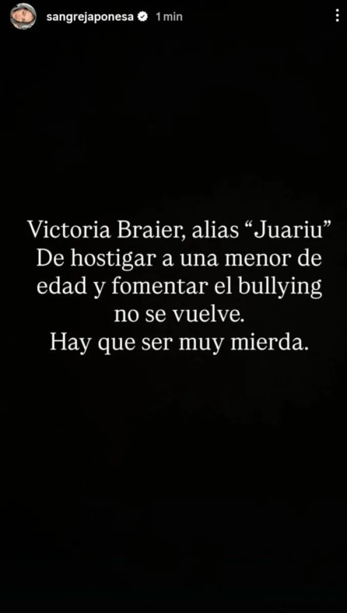 A través de sus historias de Instagram, la actriz identificó directamente a la comunicadora y lanzó una fuerte acusación. “Victoria Braier, alias ‘Juariu’. De hostigar a una menor de edad y fomentar el bullying no se vuelve. Hay que ser muy mierda”, escribió, visiblemente molesta. El mensaje fue publicado pocas horas después del festejo de Magnolia, lo que dejó en claro que el enojo fue inmediato y que la situación la afectó personalmente.