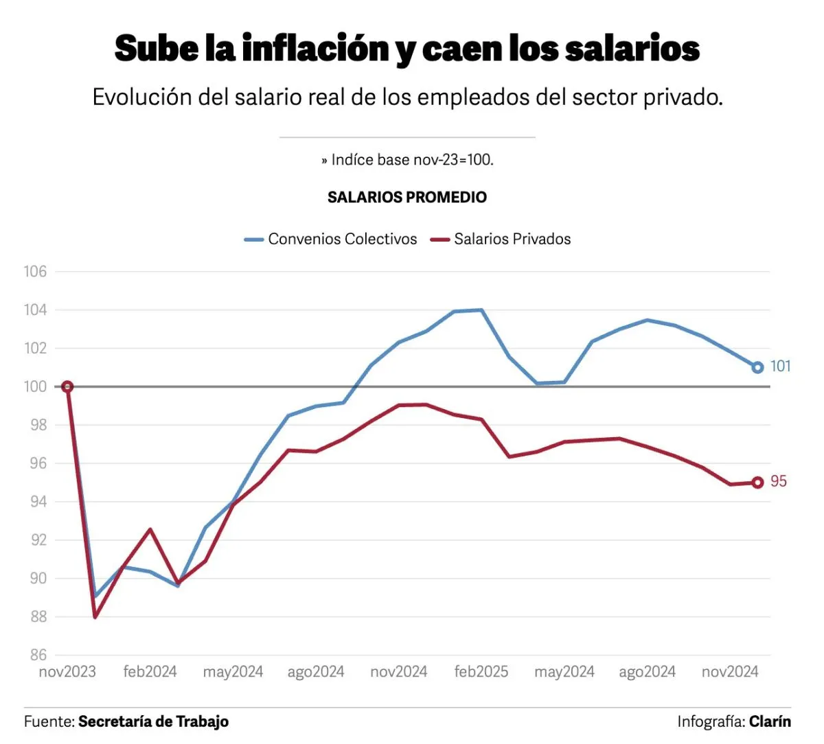 Según el gráfico publicado por Clarín, la curva de salarios reales muestra una pendiente descendente durante cuatro meses consecutivos, confirmando que la inflación volvió a ubicarse por encima de los aumentos nominales. Esta dinámica impactó especialmente en los sueldos del sector privado registrado.