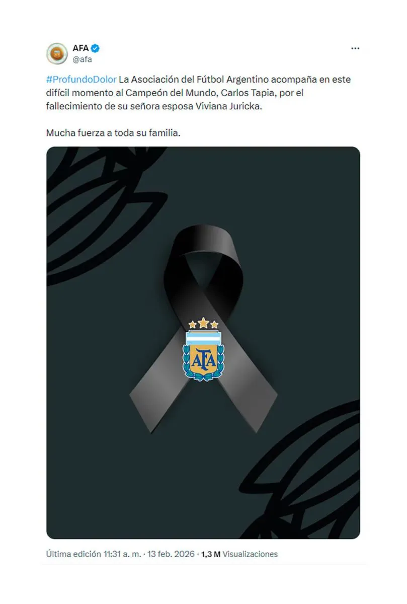 “La Asociación del Fútbol Argentino acompaña en este difícil momento al Campeón del Mundo, Carlos Tapia, por el fallecimiento de su señora esposa Viviana Juricka. Mucha fuerza a toda su familia”, expresaron desde la entidad a través de sus redes sociales, en señal de apoyo al ex integrante del plantel que conquistó el Mundial de México 1986.