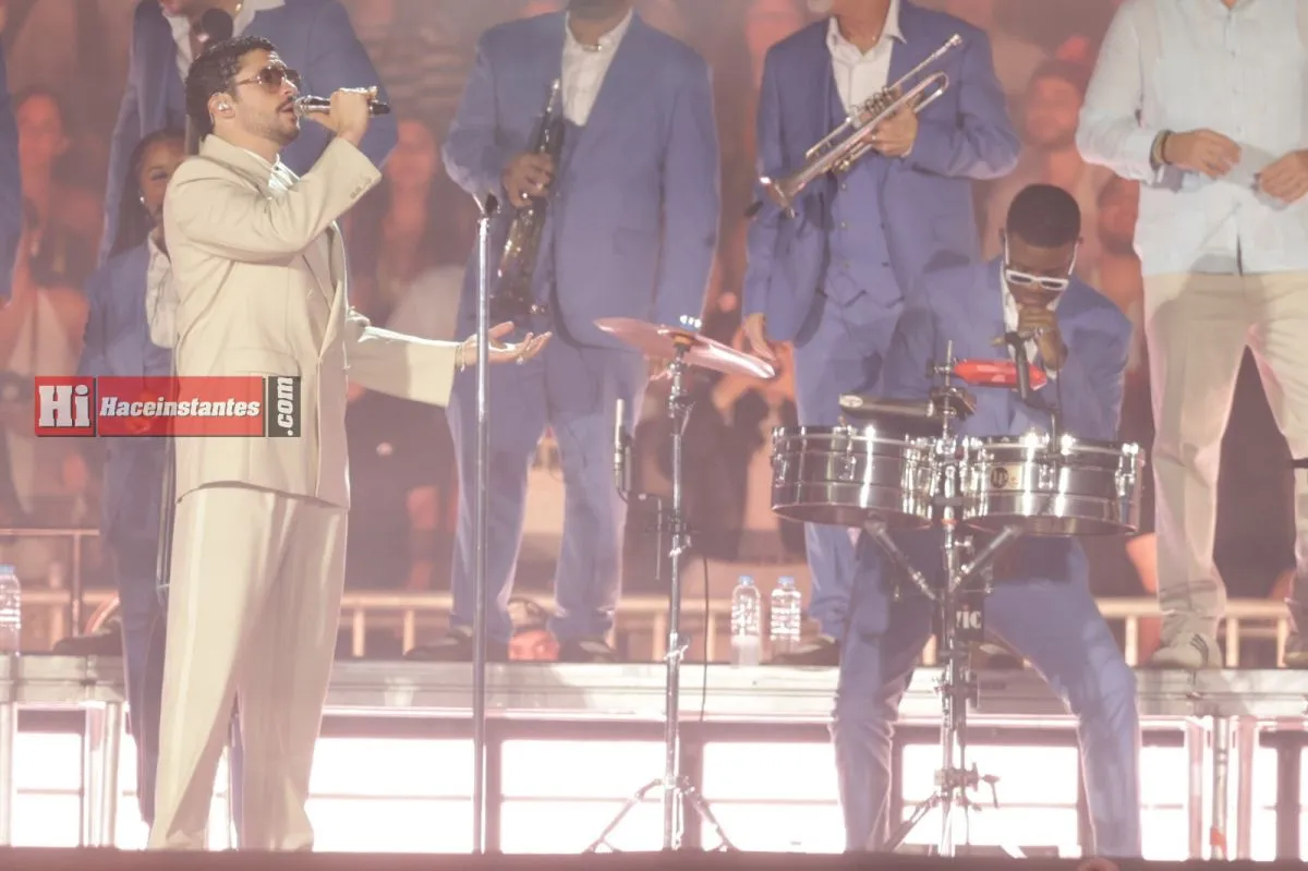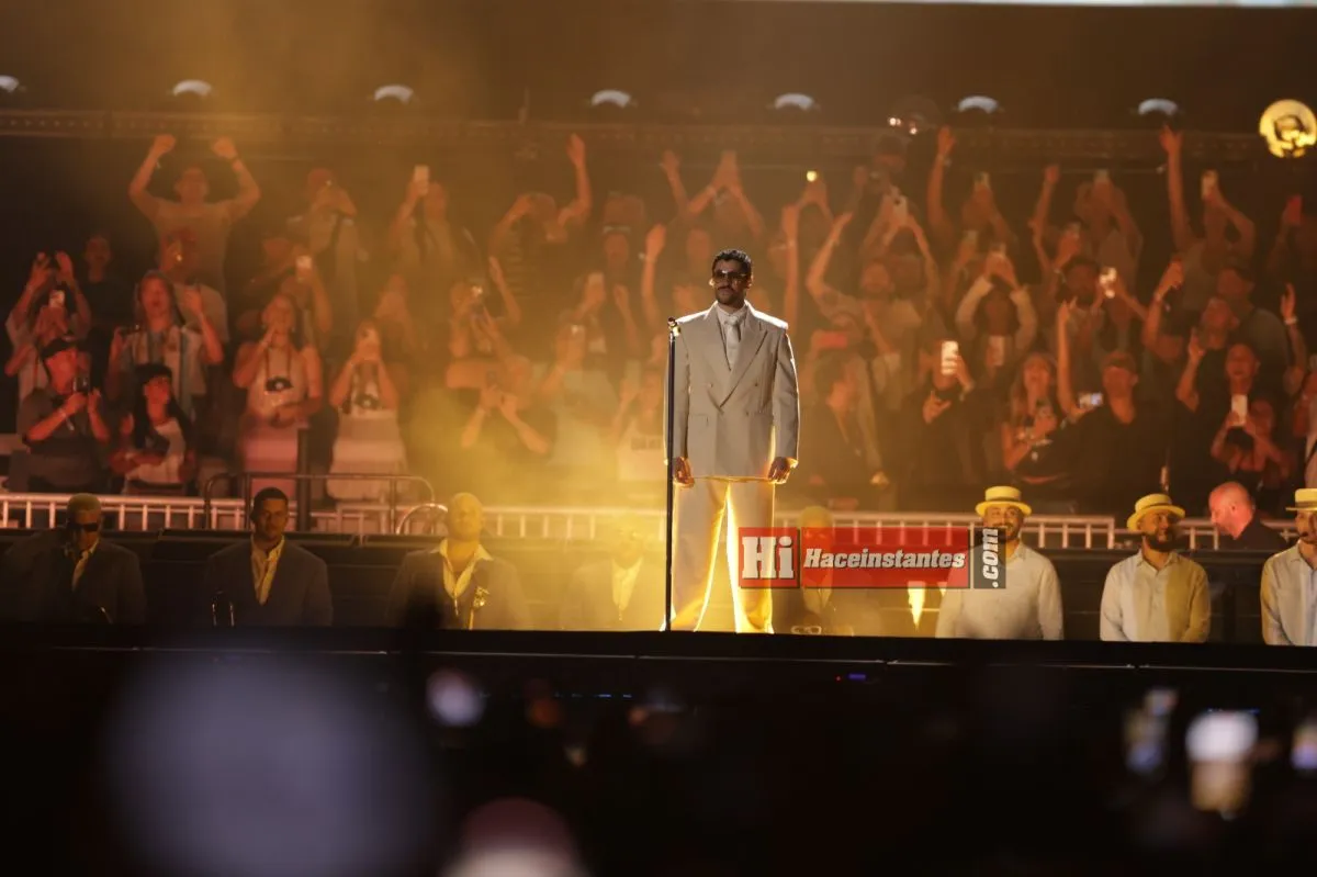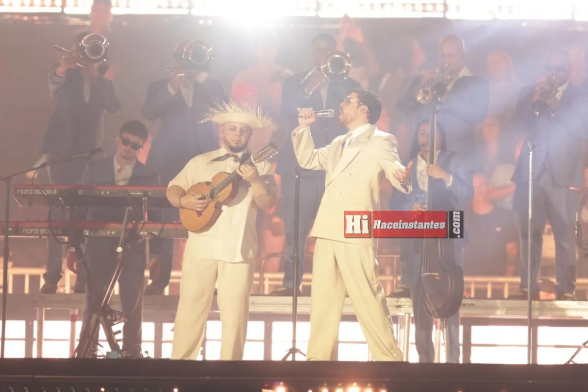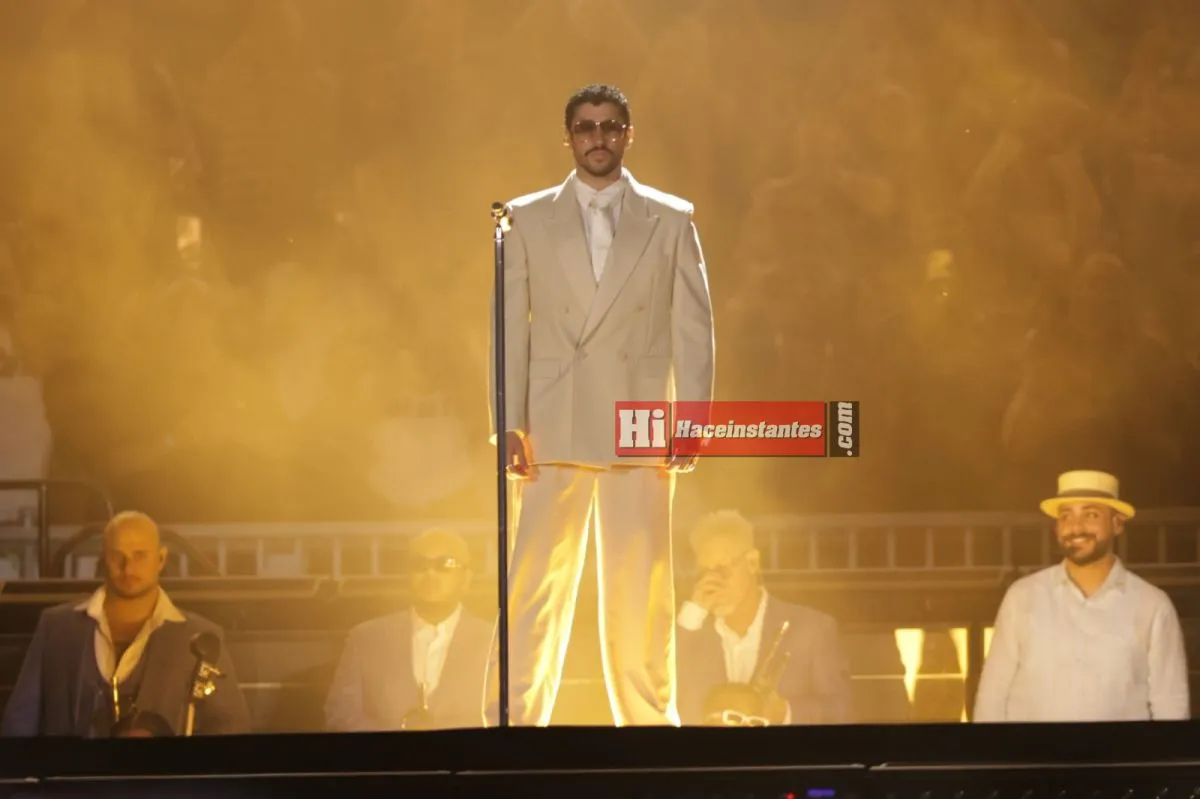 Minutos antes de las 21, la pantalla central proyectó una escena con argentinos llamando simbólicamente a Benito desde Buenos Aires. Entonces apareció él, de traje beige y lentes oscuros, ante un Monumental colmado que coreó su nombre sin pausa. El show abrió con energía desbordante y una frase ya convertida en sello: “Un aplauso pa mami y papi, porque en verdad rompieron”.